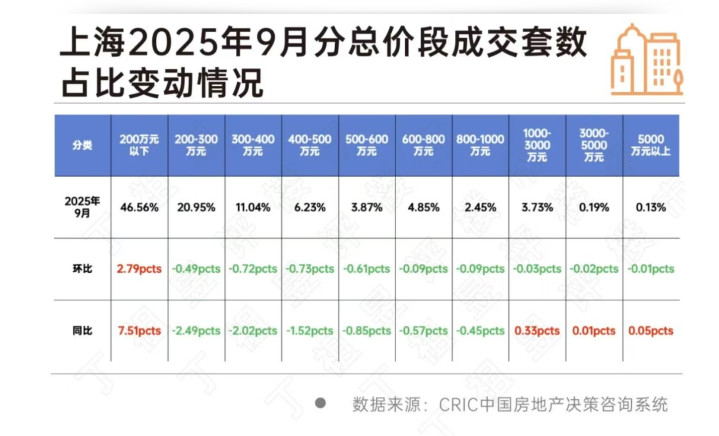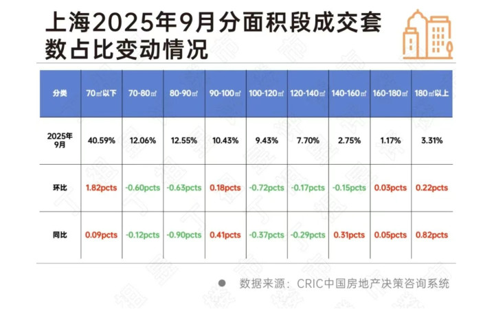 CRIC数据显示,2025年9月总价200万以内房源成交套数占比为46.56%,环比上升2.79pcts,同比上升7.51pcts;成交面积段中70平以内小面积段仍是成交主力,9月成交套数占比在40%以上。