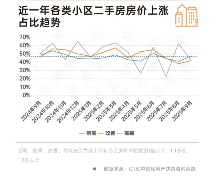 CRIC数据显示,9月全上海有47%的刚需小区房价实现环比上涨,较上月增加6个百分点。相比之下,改善类小区房价上涨占比为42%,虽较上月提升4个百分点,但仍低于刚需类小区。
