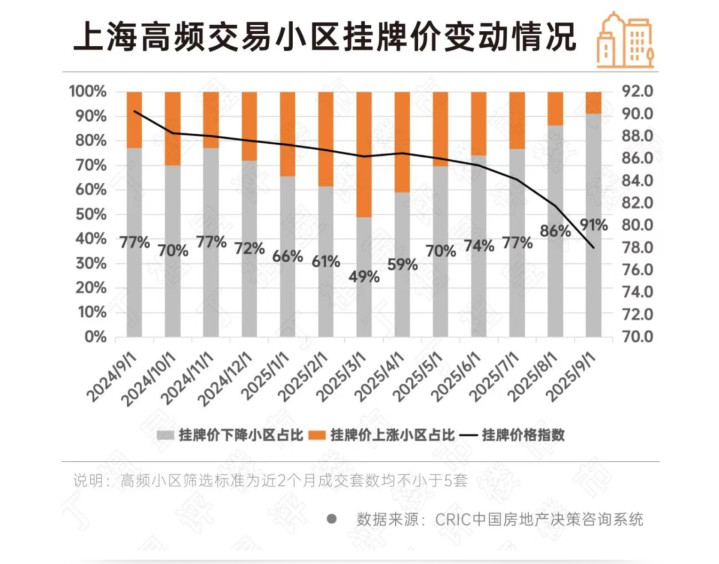 从上海高频交易小区(连续两月成交量≥5套)挂牌价变动情况来看,2025年二季度以来,上海下调挂牌价格的小区占比逐月上升,从3月的49%小区下调挂牌价格,攀升至9月的91%,创历史新高。