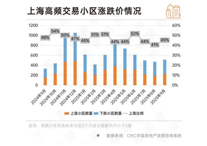 从上海高频交易小区涨跌价情况来看,近一年来,2025年8月是上海高频交易小区成交价格上涨比例最少的一个月,仅41%小区上涨。进入9月,这一局面有所改善房价上涨的高频交易小区占比升至45%,从绝对数量看,9月房价上涨的高频交易小区达233个,较8月环比增加21%。