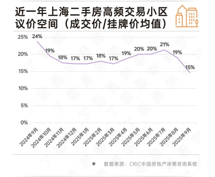 对比成交及挂牌价可以发现,9月上海二手房议价空间从8月的19%进一步收窄至15%,创近一年新低,挂牌价中的“水分”被快速挤出。