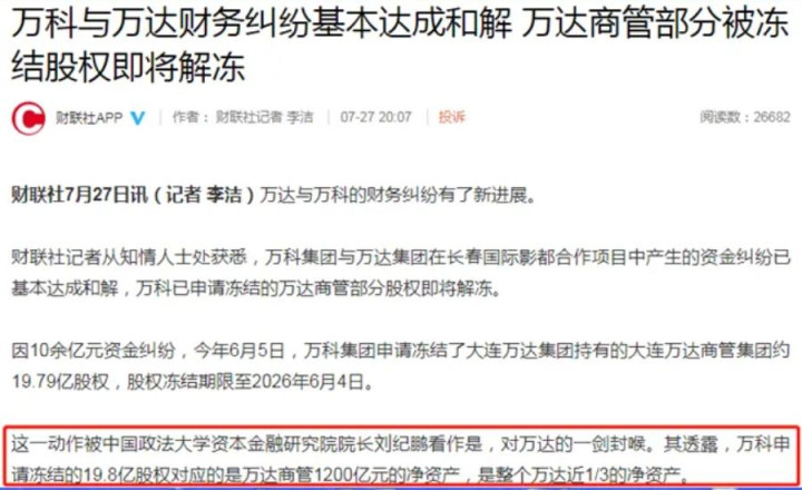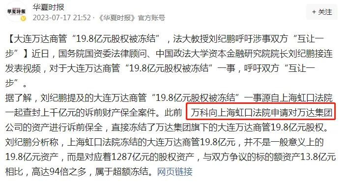结果在2023年6月,在万达冲击IPO的关键时刻,万科背后捅刀将万达告上法庭,申请冻结了万达19.8亿资产,连带着万达价值1200多亿的股权受限制。这等于间接宣告万达2023年底冲击IPO的计划失败,差点要了王健林老命。